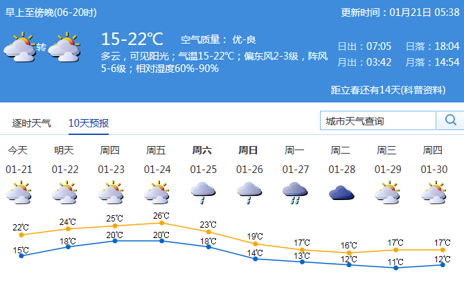 見圳客戶端·深圳新聞網(wǎng)2020年1月21日訊 據(jù)深圳市氣象臺消息,今日深圳多云,可見陽光;氣溫15-22℃;偏東風2-3級,陣風5-6級;相對濕度60%-90%。預計早晨天氣偏涼,出門注意保暖,預防感冒。