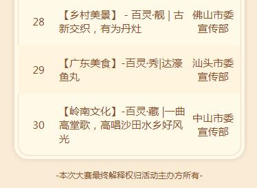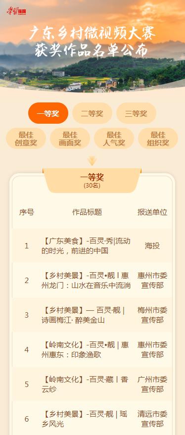 據(jù)了解,為慶祝新中國(guó)成立70周年,生動(dòng)展示黨的十八大以來,廣東高舉習(xí)近平新時(shí)代中國(guó)特色社會(huì)主義思想偉大旗幟、深入推進(jìn)美麗鄉(xiāng)村建設(shè)的豐碩成果,廣東鄉(xiāng)村微視頻大賽于8月20日正式啟動(dòng)。本次微視頻大賽歷時(shí)2個(gè)多月,共征集參賽作品9375條,審核展示5996條。廣東學(xué)習(xí)平臺(tái)PC端和手機(jī)APP開設(shè)參賽作品展播專題。經(jīng)過網(wǎng)上展播和網(wǎng)絡(luò)投票,以及專家評(píng)審,評(píng)選出一等獎(jiǎng)30名,二等獎(jiǎng)100名,三等獎(jiǎng)1000名,以及最佳創(chuàng)意獎(jiǎng)、最佳畫面獎(jiǎng)、最佳人氣獎(jiǎng)各10名。佛山、廣州、惠州等10個(gè)地級(jí)以上市黨委宣傳部獲大賽組織獎(jiǎng)。