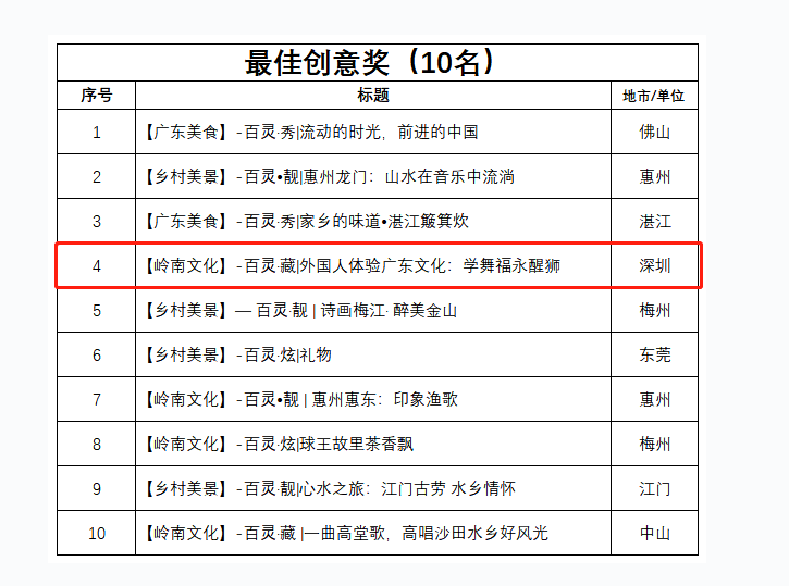 見圳客戶端·深圳新聞網(wǎng)2020年1月21日訊 1月20日,由省委宣傳部指導(dǎo)、“學(xué)習(xí)強(qiáng)國(guó)”廣東學(xué)習(xí)平臺(tái)主辦的廣東鄉(xiāng)村微視頻大賽獲獎(jiǎng)結(jié)果新鮮出爐。由深圳新聞網(wǎng)拍攝的《外國(guó)人體驗(yàn)廣東文化:學(xué)舞福永醒獅》從9375條參賽視頻中脫穎而出,獲得大賽一等獎(jiǎng)及最佳創(chuàng)意獎(jiǎng)。