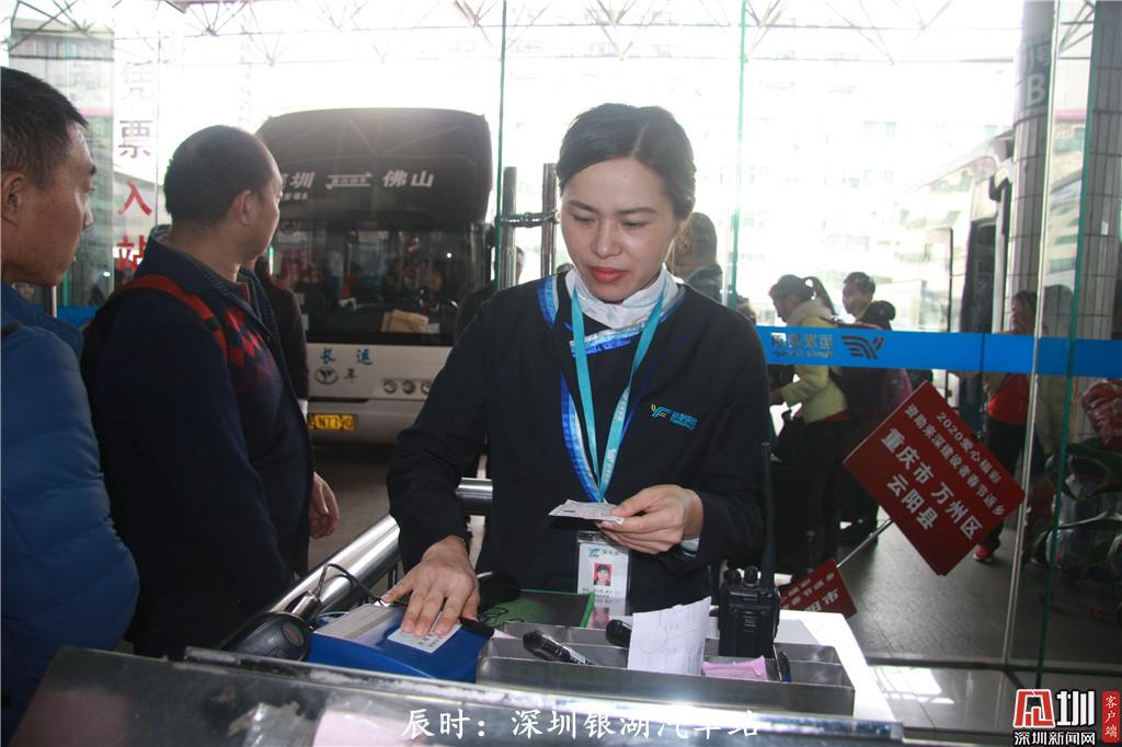 上午8點(diǎn)55分,銀湖汽車站檢票員吳偉燕正在對(duì)返鄉(xiāng)旅客進(jìn)行檢票。