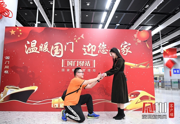 1月20日,西九龍邊檢站“國(guó)門(mén)驛站”展板前,在邊檢民警的掌聲和祝福中,旅客官先生鄭重向女友宋女士求婚,有情人終成眷屬,“在國(guó)門(mén)求婚,把愛(ài)人帶回家門(mén)”成為一段佳話(huà)。為營(yíng)造溫馨喜慶的春節(jié)氛圍,該站在口岸設(shè)置主題活動(dòng)展板,懸掛節(jié)日裝飾,還研發(fā)小程序,在驗(yàn)證臺(tái)一體機(jī)向旅客展示主題海報(bào),令人耳目一新。