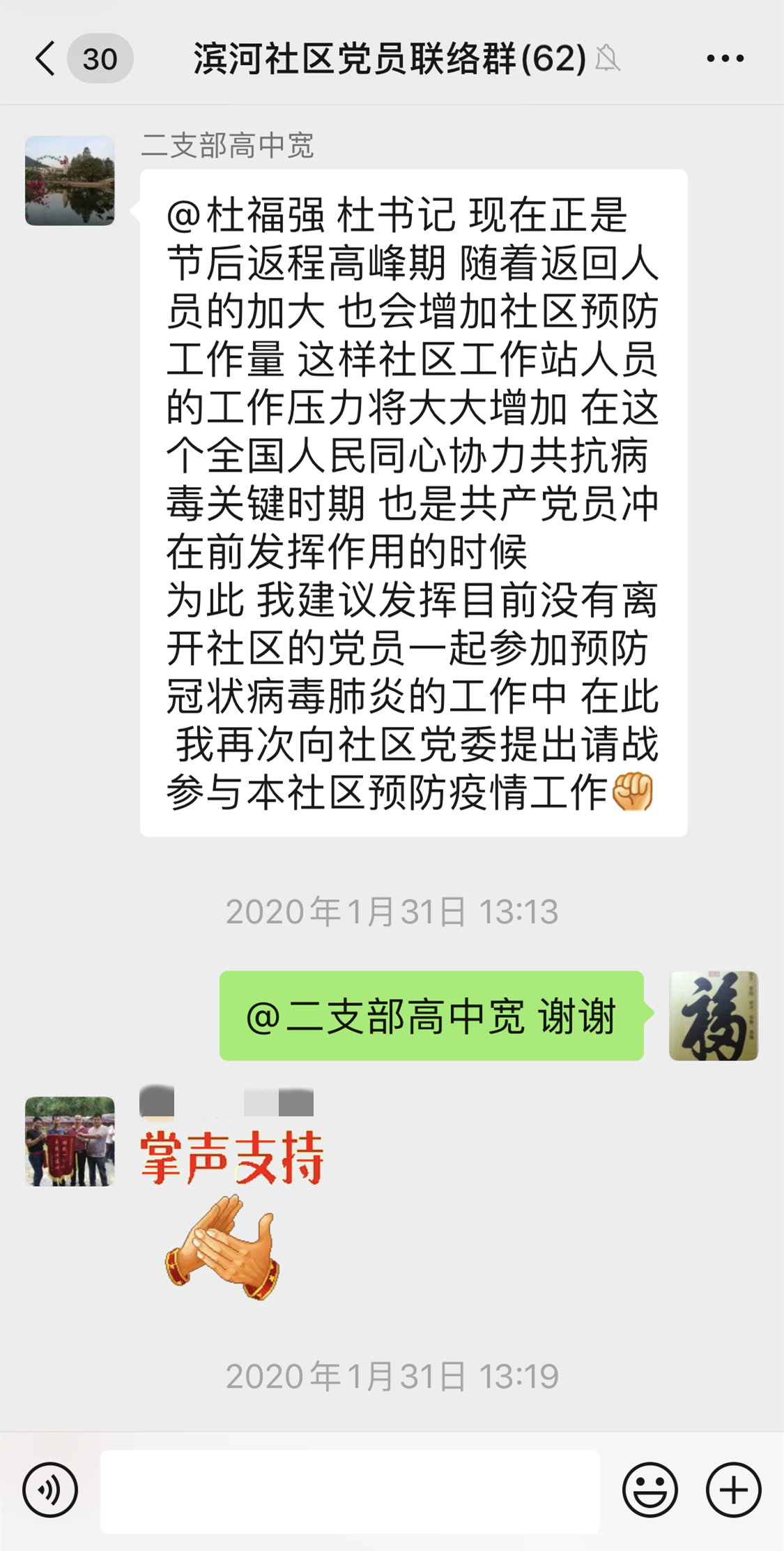 深圳新聞網(wǎng)2月2日訊(見圳客戶端、深圳新聞網(wǎng)記者 邱曉潔)“在此,我再次向社區(qū)黨委提出請戰(zhàn)參與本社區(qū)預(yù)防疫情工作?!?月31日,福田區(qū)南園街道濱河社區(qū)老黨員高中寬在濱河社區(qū)黨員聯(lián)絡(luò)微信群里再次主動請纓參與社區(qū)疫情防控工作。