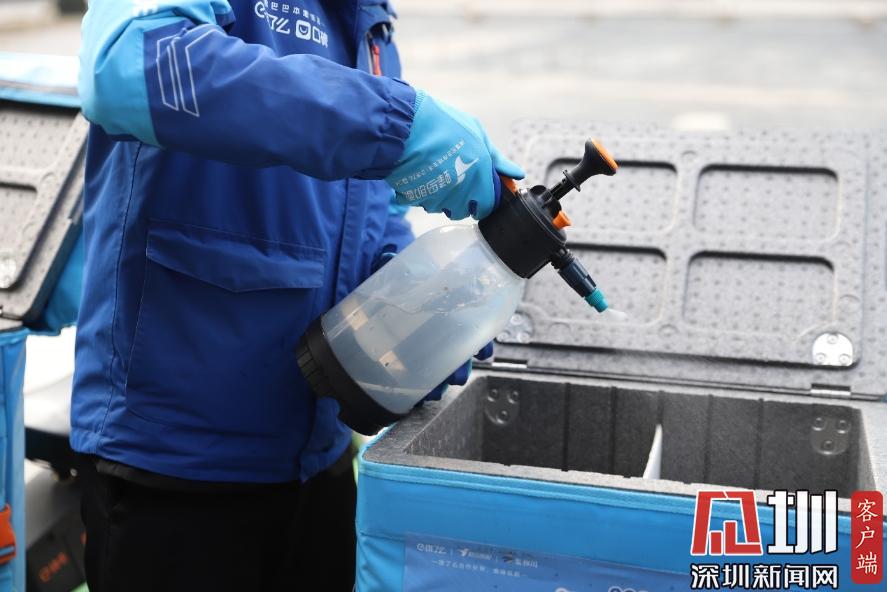 外賣小哥向保溫箱內(nèi)噴灑消毒液進行消毒。