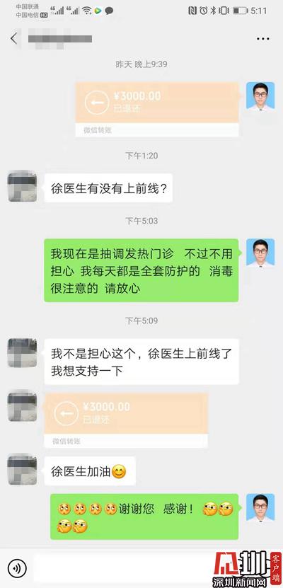 2日上午,寶安中醫(yī)院(集團(tuán))隔離病房工作的徐醫(yī)生,遇到了令他十分感動(dòng)的事。他通過(guò)微信向房東交房租,房東問(wèn)他是不是在防控前線工作,徐醫(yī)生以為房東怕傳染而嫌棄他,連忙向房東解釋自己做好了防護(hù)消毒,不用擔(dān)心,沒(méi)想到房東直接把房租退了回去,表示要支持徐醫(yī)生在前線工作,真是暖心?。?br/>