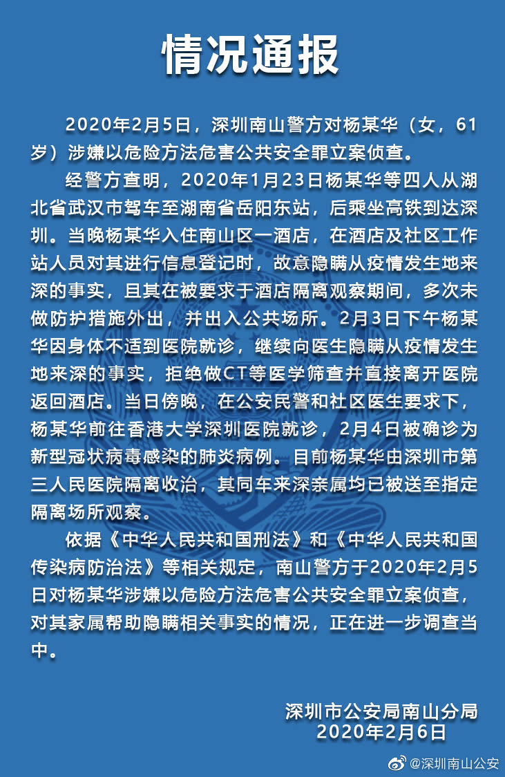 依據(jù)《中華人民共和國刑法》和《中華人民共和國傳染病防治法》等相關(guān)規(guī)定,南山警方于2020年2月5日對楊某華涉嫌以危險方法危害公共安全罪立案偵查,對其家屬幫助隱瞞相關(guān)事實(shí)的情況,正在進(jìn)一步調(diào)查中。