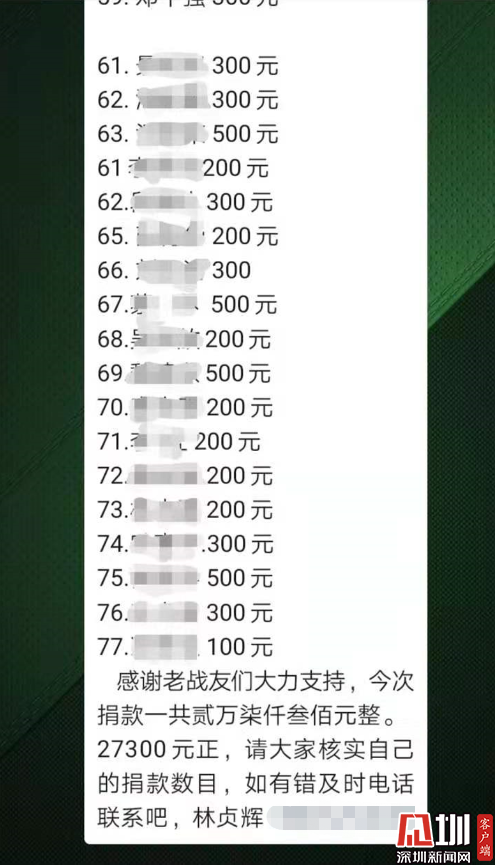 “各位戰(zhàn)友,現(xiàn)在疫情形勢如此嚴峻,正是需要我們排憂解難的時候,我們不能袖手旁觀,現(xiàn)向戰(zhàn)友們發(fā)起防護口罩捐助倡議……”早在2月2日,林貞輝便在翠竹街道退役軍人微信群里發(fā)起捐款倡議。捐款的倡議一發(fā)出,便得到熱烈響應(yīng),退役軍人們紛紛在群里接龍捐款:200元、300元、500元……微信群里的捐款數(shù)字不斷累加,不到一天的時間,便籌集到來自76位退役軍人的愛心善款27300元。