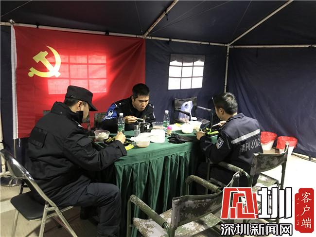 大鵬公安分局機訓大隊的隊員們在帳篷內用午餐