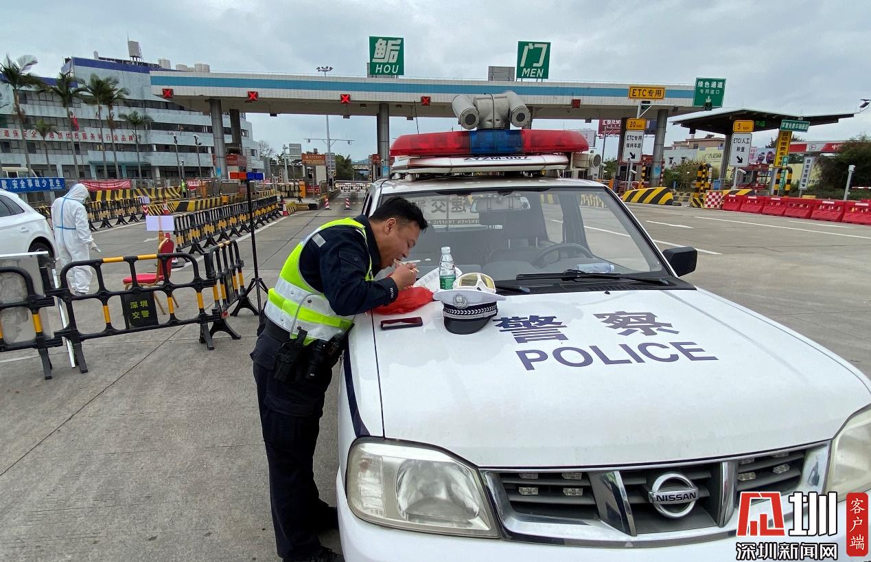 蘇廷源在鲘門高速口防疫檢查站執(zhí)勤,對進入深汕合作區(qū)的車輛及人員進行逐一排查。排查途中,蘇廷源抽空在警車旁迅速解決了自己的午餐。(見圳客戶端、深圳新聞網(wǎng)記者羅瑜)