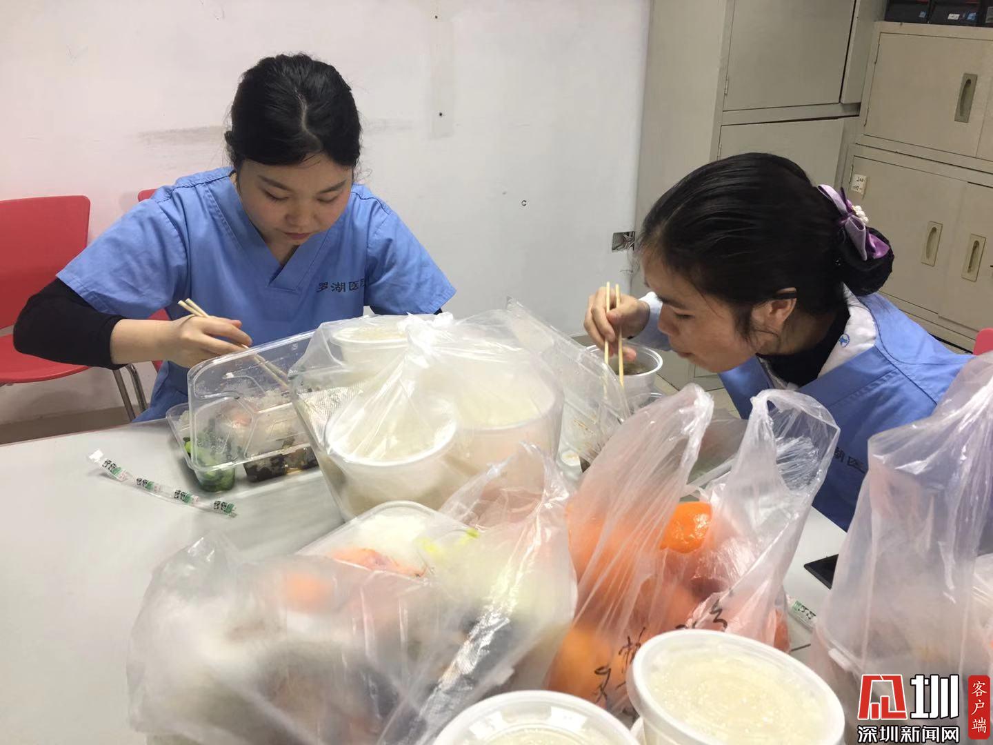 2020年2月6日,正在用午餐的羅湖區(qū)人民醫(yī)院發(fā)熱門診醫(yī)護人員。因為新型冠狀病毒感染的肺炎疫情形勢嚴峻,醫(yī)護人員由以往的到食堂吃飯,改為現(xiàn)在將飯統(tǒng)一領回到辦公區(qū),大家到辦公室分餐吃。為避免集中用餐,改為分批輪流吃飯。(見圳客戶端、深圳新聞網(wǎng)記者彭桂紅)