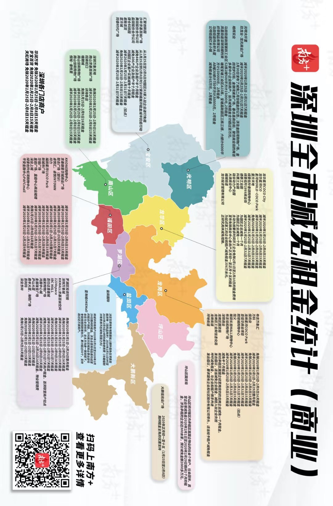 這次做了一個深圳抗疫惠企減免租金地圖,對各種政策做了盤點,涉及多個企業(yè)及十區(qū),讀者可以一一查閱。