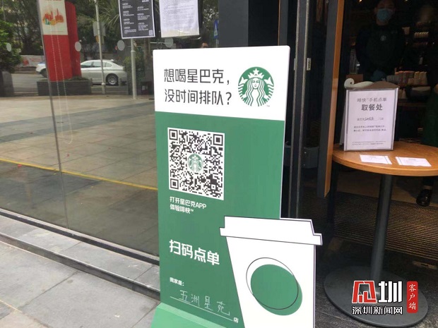 星巴克門前設(shè)置“掃碼點(diǎn)單”。