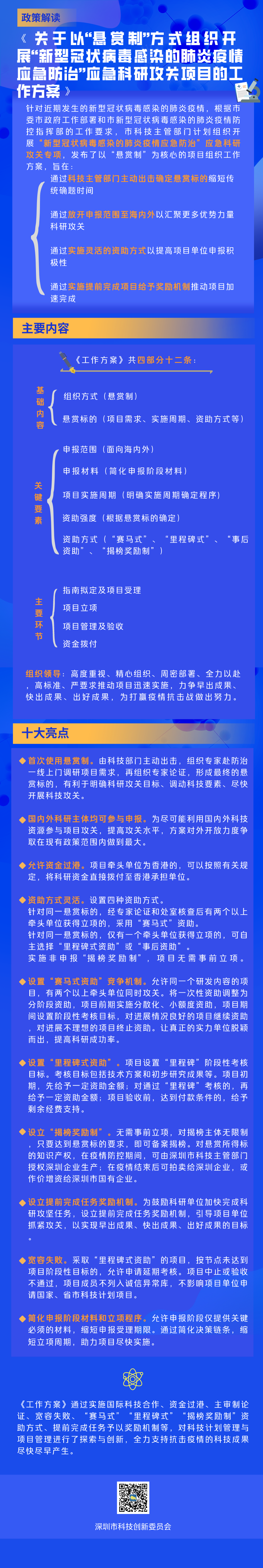 據(jù)悉,該方案首次使用懸賞制,由科技部門主動出擊,組織專家赴防治一線上門調(diào)研項目需求,再組織專家論證,形成最終懸賞標(biāo)的。深圳市科創(chuàng)委相關(guān)負(fù)責(zé)人表示,以“懸賞”為方案核心有利于明確科研攻關(guān)目標(biāo)、調(diào)動科技要素、盡快開展科技攻關(guān)。此外,為盡可能利用國內(nèi)外科技資源參與項目攻關(guān),提高攻關(guān)水平,方案對外開放力度爭取在現(xiàn)有政策范圍內(nèi)做到最大,國內(nèi)外科研主體均可參與申報。