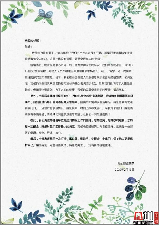 見圳客戶端·深圳新聞網2020年2月13日訊(見圳客戶端·深圳新聞網記者 潘潤華)“他們對疫情的恐懼并不少半分,可卻堅持在工作崗位?!薄八麄兙褪俏覀冃哪恐械哪嫘姓?。守護著我們的安全?!苯?,一幕幕暖心畫面在深圳上演,不少業(yè)主紛紛踴躍為物業(yè)員工捐款,以表達對這些“平安守護者”“逆行人”的謝意。