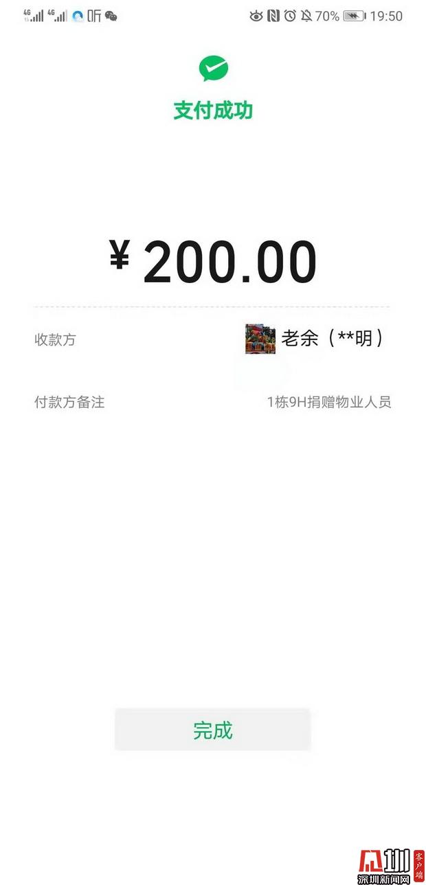 日前,深云村居民在微信群里討論小區(qū)防疫工作時,談到物業(yè)服務中心在防疫工作中投入大量人力物力,在防疫物資和人員不足的情況下加班加點地工作,有居民提議想對小區(qū)物業(yè)服務中心防疫一線的工作人員進行“打賞”,表達對他們的感激之情。深云村業(yè)委會聞訊后,迅速對這一提議進行了跟進討論,并于2月6日向小區(qū)居民發(fā)出《關于為深云村物業(yè)服務中心防疫一線員工打賞的倡議書》,呼吁小區(qū)居民以戶為單位通過手機掃碼的方式向特定賬戶“打賞”,得到居民的熱烈響應。據了解,截至2月12日16:47,該小區(qū)居民共打賞982筆,總金額達119237.54元。
