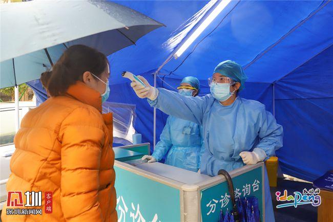 在葵涌人民醫(yī)院預(yù)檢分診處,護(hù)士為就診者檢測(cè)體溫。(見圳客戶端、深圳新聞網(wǎng)記者 黎陽(yáng) 李小輝 通訊員 張莉)