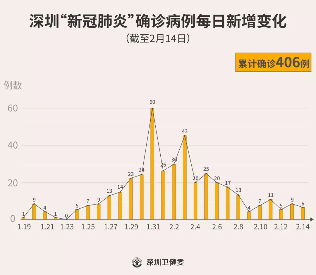 見圳客戶端·深圳新聞網2020年2月15日訊 截至2月14日24時,深圳累計報告“新冠肺炎”確診病例406例。2月14日當天全市新增確診病例6例(個案詳情今晚公布)。