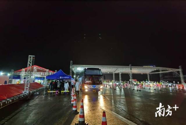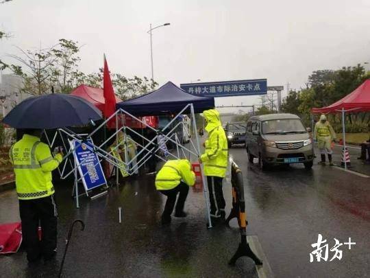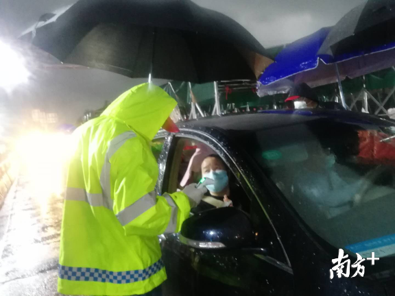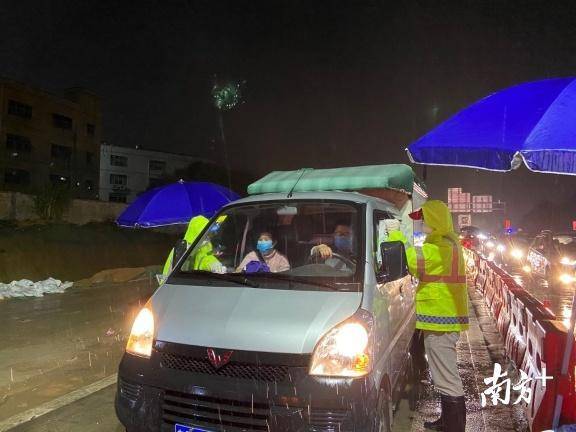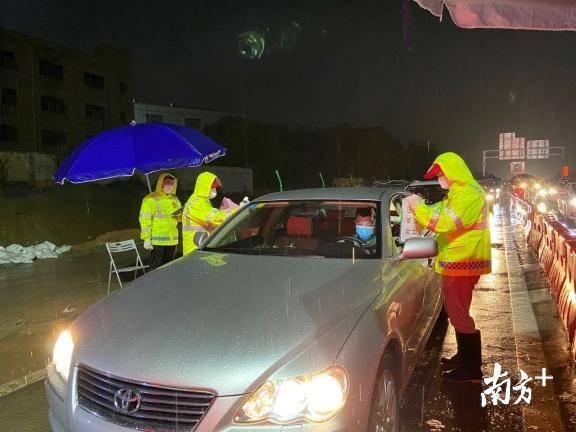 寶安區(qū)羅田檢疫站指揮部總指揮,石巖街道黨工委副書記、人大工委主任鄧亞虎,石巖街道副主任林志明和羅田交通聯(lián)合檢疫站臨時黨支部黨員冒雨檢查。當晚,深圳市公安局經(jīng)偵支隊支援4名民警在現(xiàn)場冒雨防疫檢查。