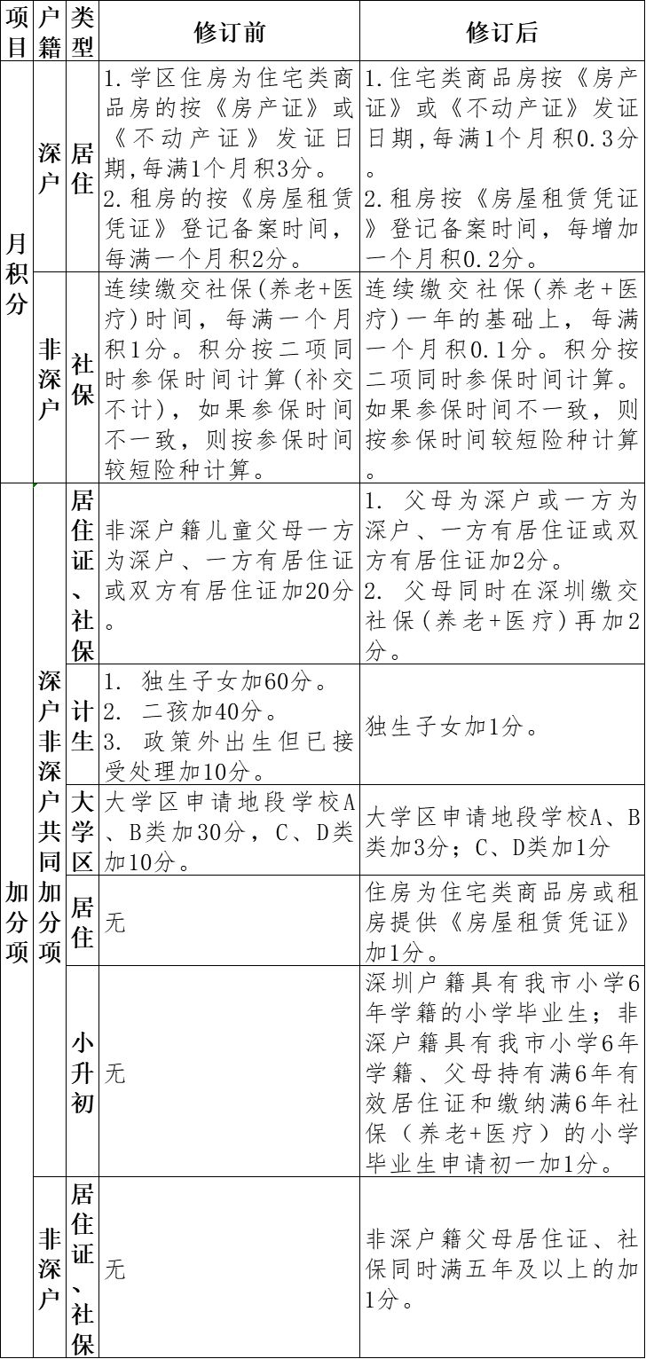 (1)深圳戶籍購(gòu)房從每滿1個(gè)月積3分,調(diào)整為積0.3分;租房從每滿1個(gè)月積2分,調(diào)整為0.2分。