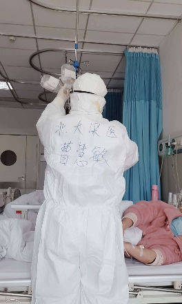 深圳醫(yī)療隊(duì)隊(duì)員曹慧敏在為患者服務(wù)。為了方便在“艙室”內(nèi)互相辨識(shí),醫(yī)護(hù)人員都在自己的衣服上用記號(hào)筆寫上了名字。
