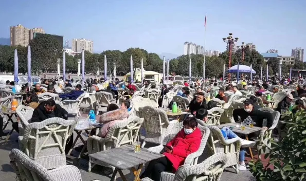 ▲2月21日,四川廣元不少人出門曬太陽。在利州廣場,市民扎堆喝壩壩茶,一市民拍視頻稱現(xiàn)場人山人海。