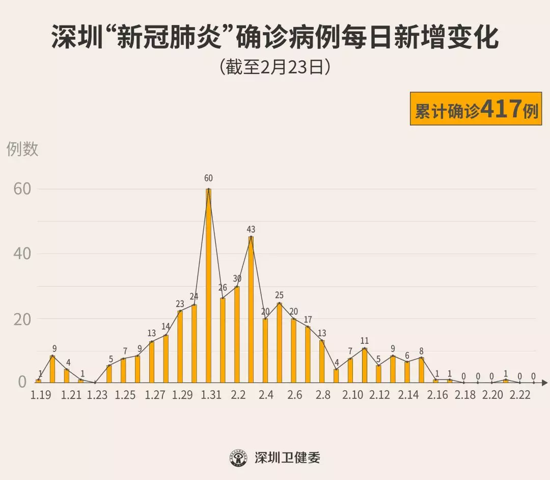 截至2月23日24時(shí),深圳累計(jì)報(bào)告“新冠肺炎”確診病例417例。2月23日當(dāng)天全市無(wú)新增確診病例。 ▲新增出院病例已超過新增確診病例 累計(jì)報(bào)告確診病例中,男性197例、女性220例。 按照病例管理地區(qū)劃分,南山區(qū)87例、福田區(qū)81例、龍崗區(qū)71例、寶安區(qū)62例、龍華區(qū)34例、羅湖區(qū)32例、光明區(qū)11例、坪山區(qū)7例、鹽田區(qū)6例、大鵬新區(qū)2例、其他(指由機(jī)場(chǎng)、車站、碼頭、關(guān)口、路卡等直接送往定點(diǎn)醫(yī)院的)24例。 目前,重癥5例、危重癥8例,死亡3例,累計(jì)出院237例。 177例確診病例均在深圳市第三人民醫(yī)院隔離治療。 159例密切接觸者正在接受醫(yī)學(xué)觀察。 資料來源:深圳市疾控中心、深圳市衛(wèi)健委、廣東省衛(wèi)健委