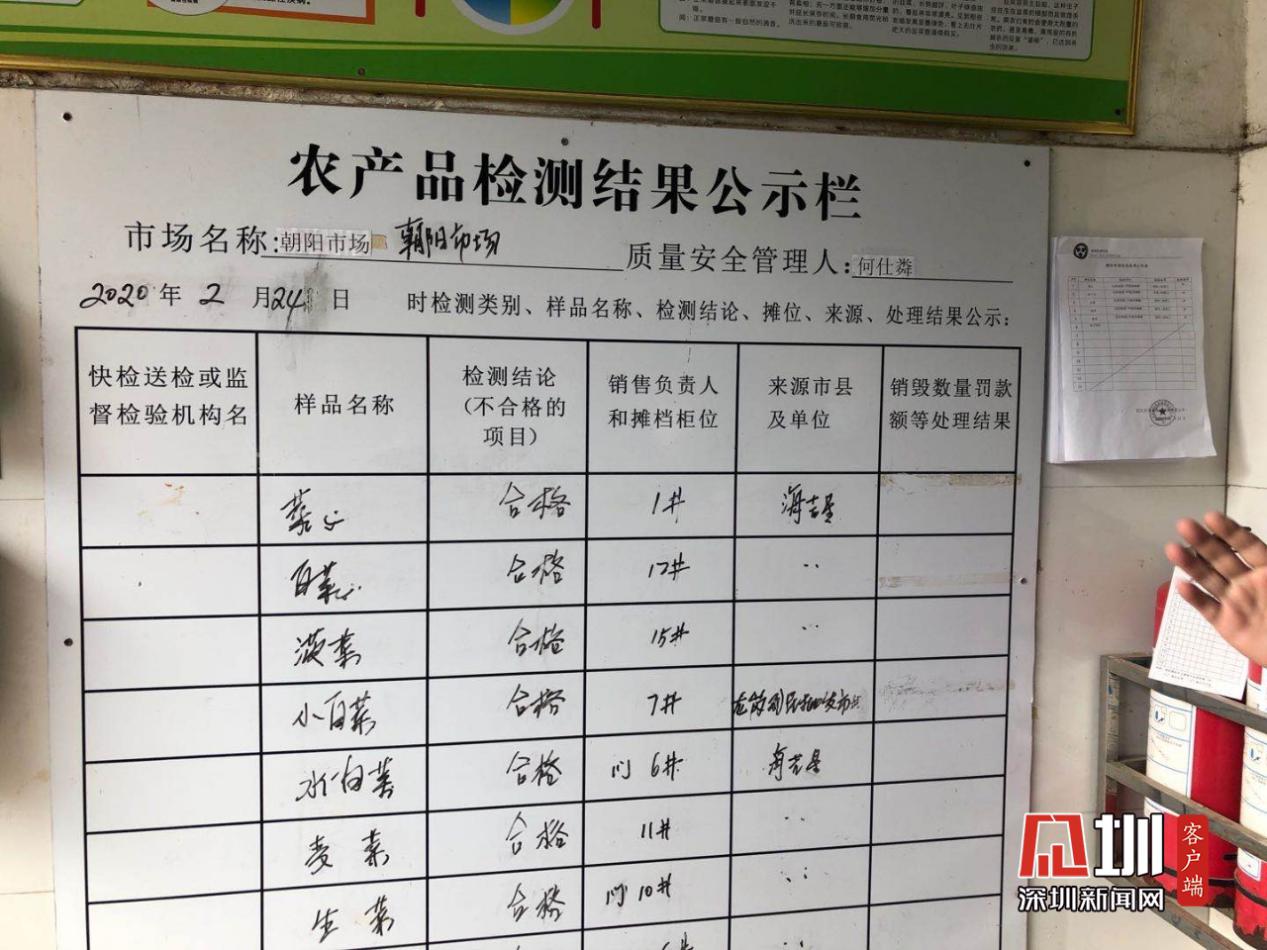 “朝陽肉菜市場從2005年開始開辦,市場占地面積為2480平方米,建筑面積和經(jīng)營面積均為2220平方米,目前市場經(jīng)營攤檔共有82檔。市場附近有三個社區(qū),每天有將近兩萬居民都會來這個市場采購食材。市場設有農(nóng)殘檢測設施,每天都會對進貨的蔬菜進行農(nóng)殘檢測并公示?!笔袌鲐撠熑苏f道。