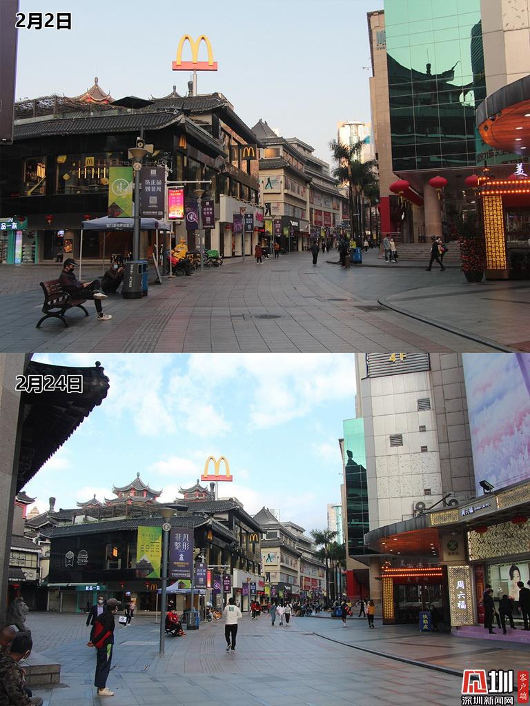 上圖為2月2日,在東門步行街人煙稀少,下圖為2月24日,東門步行街進入復(fù)工第一天,營業(yè)的店面開始增多。