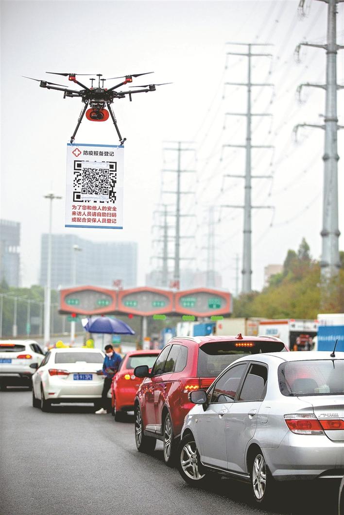 2月11日,在G94高速深圳觀瀾收費處,深圳龍華機訓大隊無人機飛行隊的民警操作懸掛有申報二維碼的無人機在候檢的車輛間飛行。晶報記者賴犁攝