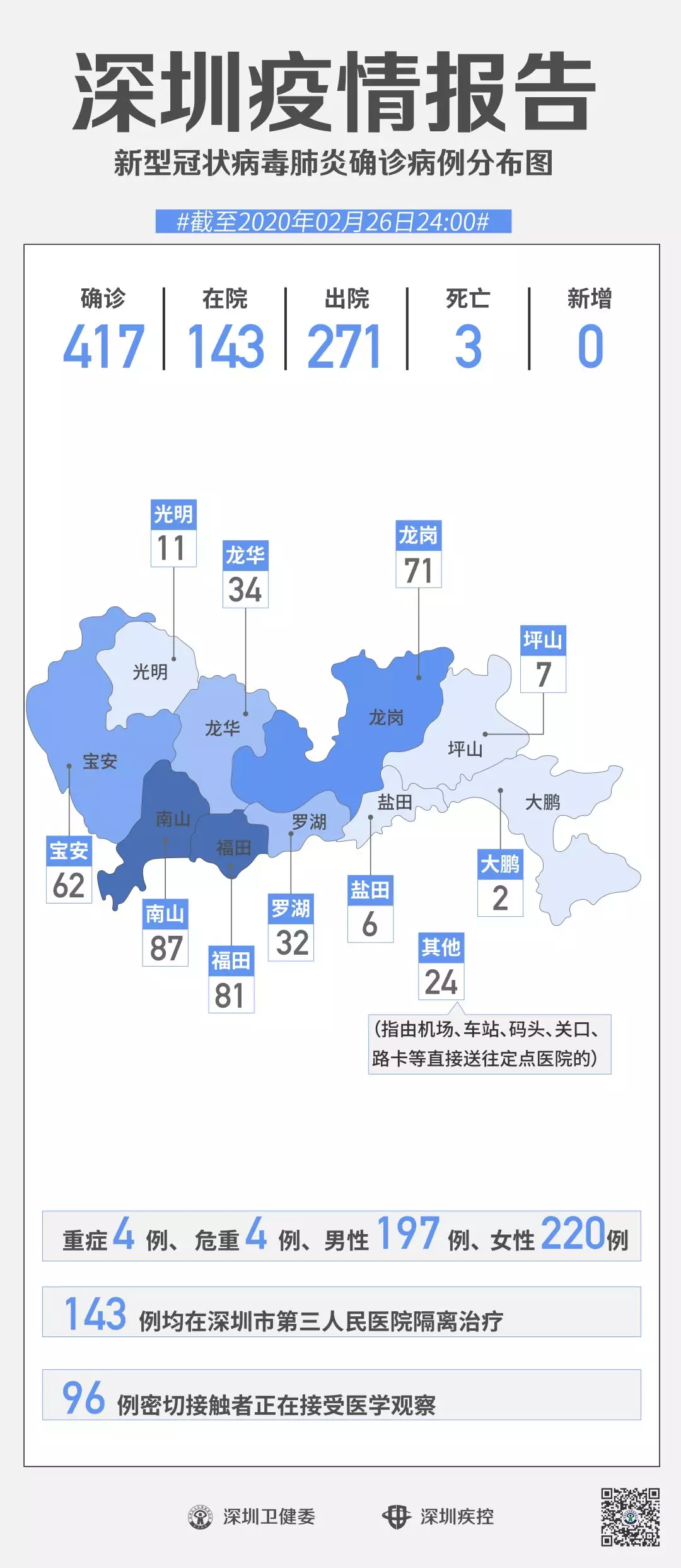 截至2月26日24時,深圳累計報告“新冠肺炎”確診病例417例。2月26日當天全市無新增確診病例,當天出院病例9例(從26日起不再公布出院個案)。