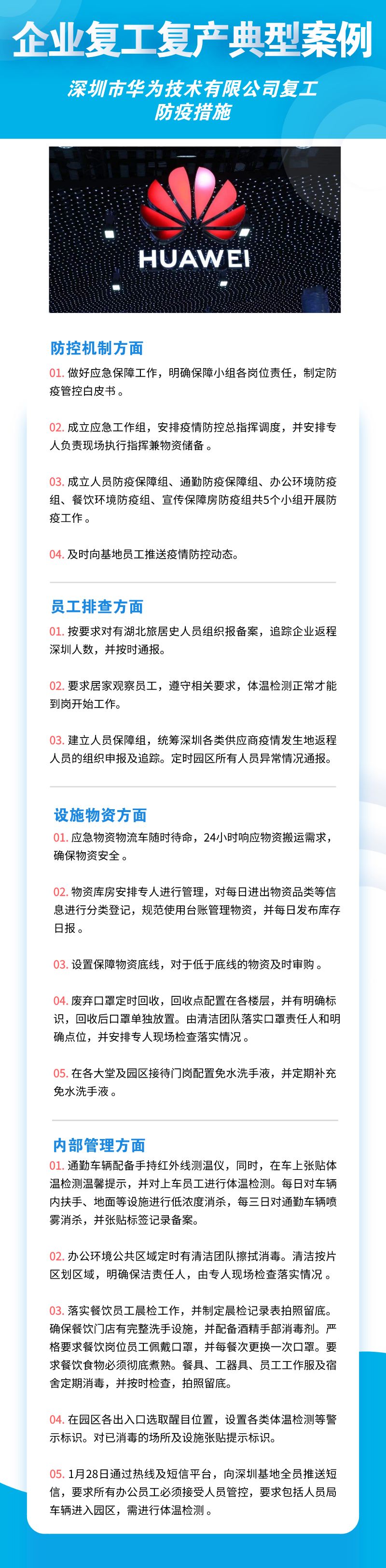 深圳市華為技術(shù)有限公司、聯(lián)想系統(tǒng)集成(深圳)有限公司、深南電路股份有限公司、比亞迪股份有限公司、創(chuàng)維集團股份有限公司等8家公司,從防控機制、員工排查、設(shè)施物資、內(nèi)部管理四個方面來落實疫情防控措施,包括成立企業(yè)疫情防控小組、建立企業(yè)防控機制、提升員工防控意識、劃分隔離區(qū)域、宿舍食堂等區(qū)域消殺等舉措。