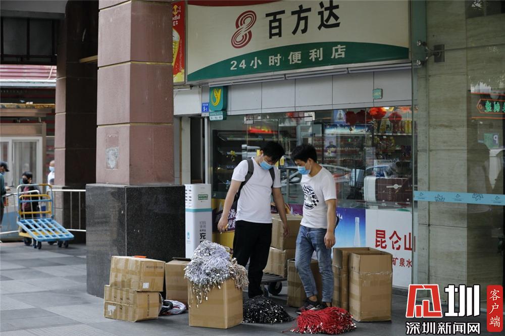 華強(qiáng)北龍勝配件城附近,搬運(yùn)貨物的人均有佩戴口罩。