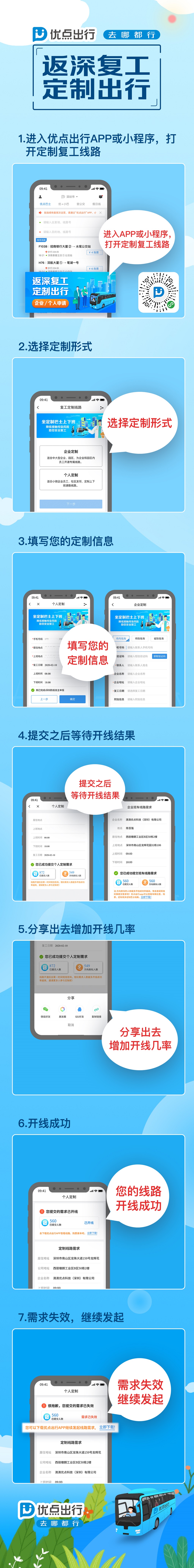 復(fù)工企業(yè)和個人在“優(yōu)點出行”APP或“優(yōu)點巴士”小程序中提交申請、填寫復(fù)工出行需求,由優(yōu)點出行平臺聚合生成復(fù)工專線并通知乘客,深圳巴士集團提供安全消毒的車輛進行乘客運輸。