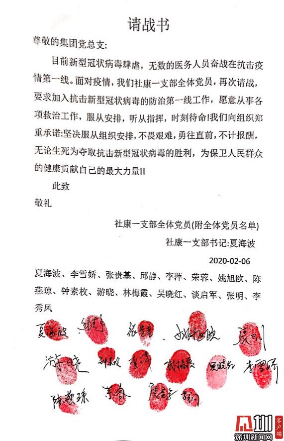 見圳客戶端·深圳新聞網(wǎng)訊(記者 董非)“讓黨旗在防控斗爭第一線高高飄揚?!毙鹿诜窝滓咔榘l(fā)生以來,南山區(qū)醫(yī)療集團總部黨員勇當先鋒,以實際行動踐行初心使命,涌現(xiàn)出眾多感人故事,展現(xiàn)了共產(chǎn)黨員的風采與擔當。 疫情發(fā)生后,南山區(qū)第一時間制定出臺了《黨建引領(lǐng)疫情防控工作五項行動方案》,南山區(qū)委書記王強號召全體黨員,發(fā)揮黨組織的戰(zhàn)斗堡壘作用和黨員的先鋒模范作用,全力保障人民群眾生命安全和身體健康,讓黨旗在防控疫情斗爭第一線高高飄揚,堅決打贏疫情防控人民戰(zhàn)爭、總體戰(zhàn)、阻擊戰(zhàn)。南山區(qū)醫(yī)療集團總部積極響應,黨建引領(lǐng)下的防控抗疫工作有序科學地展開。 今年1月底,深圳市南山區(qū)區(qū)委授旗成立南山醫(yī)療系統(tǒng)黨員突擊隊。南山區(qū)醫(yī)療集團總部緊急組建了防控新冠肺炎應急突擊隊,僅一天內(nèi)區(qū)醫(yī)療集團就共有169人完成第一批應急突擊隊報名,其中黨員過半數(shù)。 疾風知勁草,烈火煉真金。一封封請戰(zhàn)書閃電匯聚到黨總支,召即來,來能戰(zhàn),戰(zhàn)能勝,沖鋒在前就是擔當?shù)淖蠲姥堇[;一位位黨員迅速入隊黨員突擊隊,他們重溫入黨誓言,在黨旗下實踐著醫(yī)者仁心、人間大愛;一份份入黨申請書紛沓而來,特殊時期經(jīng)受特殊考驗,一批優(yōu)秀的醫(yī)護人員頁主動向黨組織靠攏。鏗鏘的語言、堅定的決心、舍我的擔當,是南山區(qū)醫(yī)療集團總部廣大黨員逆行而上、抗擊疫情的堅定決心和必勝信心。 最美逆行黨支部,積極請戰(zhàn)敢擔當 “我是共產(chǎn)黨員,我請戰(zhàn)!愿為戰(zhàn)勝疫情全力以赴!”這是南山區(qū)醫(yī)療集團總部一支部13名黨員和2名入黨積極分子聯(lián)名撰寫的《請戰(zhàn)書》(節(jié)選)。 面對新冠肺炎疫情,一支部黨員在夏海波支部書記夏海波的帶領(lǐng)下,在發(fā)熱門診、發(fā)熱患者預檢分診、社區(qū)“三位一體”排查等工作中,積極發(fā)揮共產(chǎn)黨員戰(zhàn)斗在一線、沖鋒在一線的模范帶頭作用,為戰(zhàn)勝新冠肺炎疫情全體黨員積極主動請戰(zhàn),并向集團黨總支遞交了請戰(zhàn)書。 社康一支部全體黨員的請戰(zhàn)書 一個個紅手印,令人淚目,彰顯著南山區(qū)醫(yī)療集團總部白衣天使們逆行而上的使命擔當和責任意識。 一支部書記夏海波說,“成為疫情防控工作第一線發(fā)展黨員,是面對疫情充分發(fā)揮黨員先鋒作用的具體實踐。此次請戰(zhàn),將更加激勵他們我們在今后的工作特別是近期防疫防控工作中,以黨員的標準嚴格要求自己,發(fā)揮黨員先鋒模范作用。同時,也會對全院全體員工產(chǎn)生積極引領(lǐng)、鼓舞作用,以更飽滿的斗志投入防疫防控工作。” 老黨員重溫入黨誓詞,面對黨旗表決心 “我宣誓:我志愿加入中國共產(chǎn)黨……”這是一次特別的宣誓。接到組織號召后,社康二支部的老黨員鐘達宏和吳麗娉,對著黨旗,以重溫入黨誓詞的方式,不忘黨員初心,牢記使命,積極沖鋒在前,誓要打贏防控狙擊戰(zhàn)。 社康二支部的老黨員鐘達宏和吳麗娉,對著黨旗,重溫入黨誓詞,誓要打贏防控狙擊戰(zhàn) 面對來勢洶洶的疫情,南山區(qū)醫(yī)療集團總部的黨組織和黨員干部不但沒有被嚇倒,反而激起了他們昂揚的戰(zhàn)斗意志和飽滿的工作熱情。 “我宣誓,我自愿加入抗擊新型冠狀病毒肺炎疫情防控工作隊伍,責任上肩,聽黨指揮,服從命令,科學應對,恪盡職守,努力守護轄區(qū)居民健康,堅決打贏疫情防控攻堅戰(zhàn)!”守土有責、守土擔責、守土盡責,所有社康中心的黨員干部將筑牢抗疫的基層防線,誓要守護轄區(qū)居民的生命健康。 社康二支部黨員在黨旗下宣誓努力守護轄區(qū)居民健康 艱難時刻主動請戰(zhàn),夫妻雙雙奮戰(zhàn)一線 1月26日,南山區(qū)醫(yī)療集團總部下發(fā)關(guān)于組建防控新型冠狀病毒感染肺炎應急突擊隊報名的通知。除了得到集團黨員們的積極響應之外,各個支部涌現(xiàn)出一波遞交入黨申請書的小高潮。 李婧是社康支部的一名全科醫(yī)生,一直在社康醫(yī)院中心從事全科醫(yī)療工作,戰(zhàn)“疫”的號角吹響,李婧第一時間參戰(zhàn),在所有抗疫時期入黨人員里第一個遞交了手寫入黨申請書。 李婧醫(yī)生的手寫入黨申請書 起初,她所在的蔚藍海岸社康中心考慮到李婧的愛人是深圳市公立醫(yī)院急診科醫(yī)生其愛人是深圳市某公立醫(yī)院的急診科醫(yī)生,疫情發(fā)生以來一直堅守在崗位上,家中尚有1歲零3個月的寶寶,就沒有讓她參加社區(qū)“三位一體”排查和酒店留守值班等一線工作和醫(yī)學觀察點留守值班等一線工作。李婧得知后,她主動提交請戰(zhàn)書、舍小家顧大家,并沒有因為生活上的困難而有所退縮,主動要求參與疫情排查一線工作。李婧夫妻還制定了家庭的“交接班”制度,一個去上白班,另一個就上夜班。 執(zhí)行三位一體排查工作前,李婧醫(yī)生與民警、社區(qū)工作者開會準備 在南山醫(yī)療集團第六黨支部書記蔡偉山給她的入黨介紹信中這樣寫道:李婧和她的愛人都雙雙忙碌在疫情一線李婧和她的愛人都雙雙忙碌在疫情防控一線,她這種顧全大局的無私奉獻精神,這份執(zhí)著和堅定的職業(yè)信念,為我們社康醫(yī)務人員積極