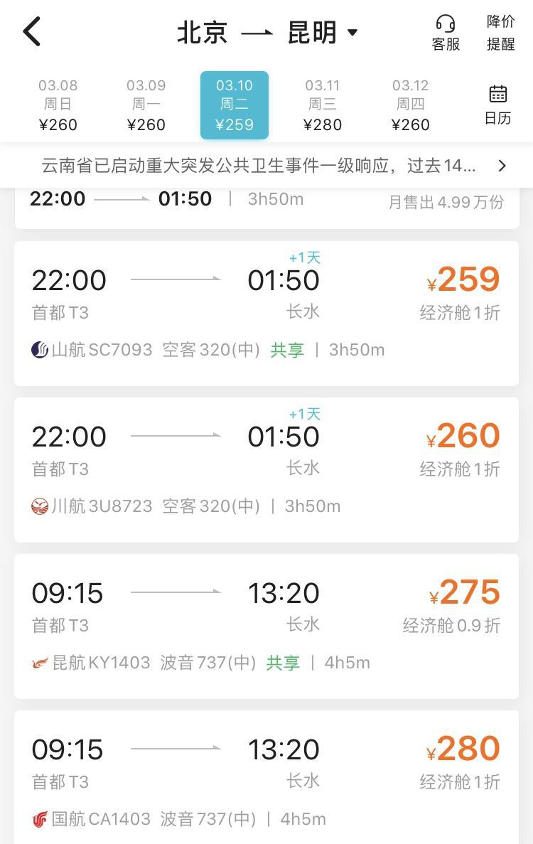 此外,3月份,由北京、上海等城市出發(fā)的航班也出現(xiàn)了1折左右的"白菜價(jià)"。比如去哪兒旅行 APP上顯示,3月10日,北京飛昆明的山航 SC7093航班,機(jī)票價(jià)格最低為259元,折扣為經(jīng)濟(jì)艙全票的1折。當(dāng)天,川航3U8723、昆航 KY1403、國(guó)航 CA1403等航班的最低票價(jià),也僅為經(jīng)濟(jì)艙全票的1折左右,價(jià)格分別為260元、275元、280元。