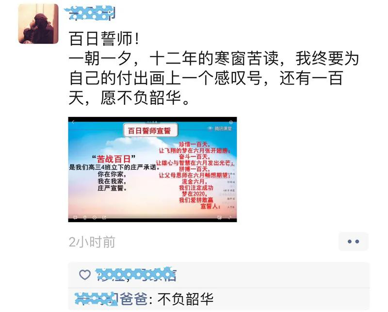 “生于非典,考于新冠,2020,我們注定不凡!疫情當(dāng)前,雖然我們隔離在家,不能像往屆那樣,齊聚學(xué)校體育館舉行誓師大會(huì),意氣風(fēng)發(fā)地走進(jìn)學(xué)校精心準(zhǔn)備的“成功門”,伴隨奮進(jìn)的樂聲高喊出我們的誓言,在“簽名紀(jì)念墻”上寫下對(duì)未來(lái)的期盼。但即使相隔網(wǎng)絡(luò)兩端,我們依然有老師祝福和引導(dǎo),有家長(zhǎng)的鼓勵(lì)和支持,有同窗的幫助和陪伴,高考百日,我們?nèi)栽谝黄鹫癖鄹吆簦?020高考,我們準(zhǔn)備好了。”