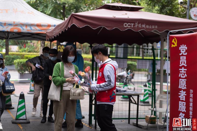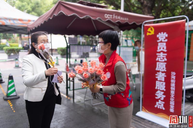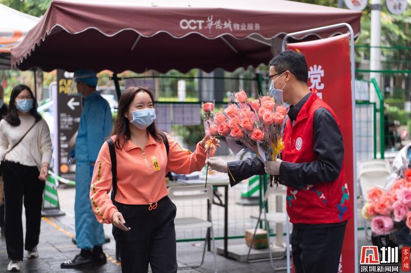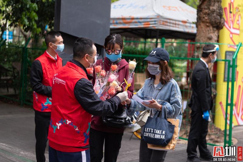 見圳客戶端·深圳新聞網(wǎng)2020年3月6日訊 3月6日上午,春暖花開,萬物更新。華僑城創(chuàng)意文化T街入口,進(jìn)入園區(qū)上班的員工除了接受體溫檢測、出示入園卡等常規(guī)動(dòng)作外,女員工意外收到了一束鮮花和一張“三八”節(jié)賀卡,賀卡上寫著:帶著溫柔堅(jiān)定的力量抗“疫”前行!這是園區(qū)黨員志愿者對“抗擊疫情、復(fù)工復(fù)產(chǎn)”中廣大女職工的禮贊。