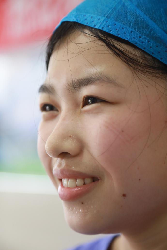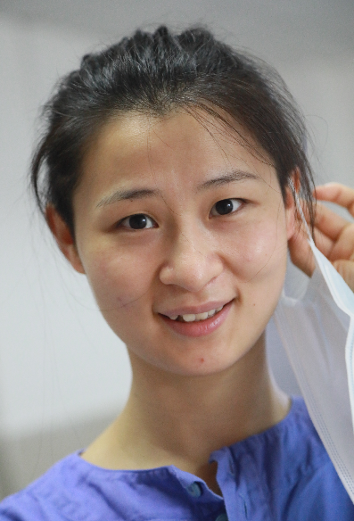 黃青青性格開(kāi)朗,適應(yīng)能力強(qiáng),她平時(shí)不愛(ài)吃的胡蘿卜、包菜等食物,但到了一線再也不挑食了。身材瘦弱的她在忙碌十多天后有些消瘦,但她總是打趣道:“別看我瘦,力量可大著呢!”協(xié)助病人翻身,耐心為病人喂飯,只要病人需要的,她都會(huì)盡自己的全力做好,病區(qū)的病人也為她豎起大拇指。