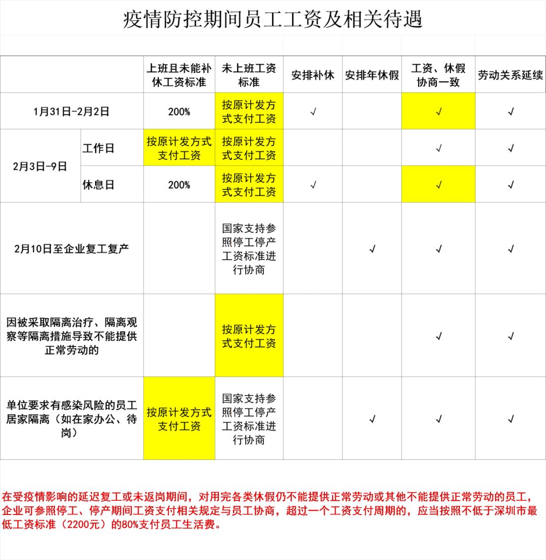 在2月3日至9日(廣東省延遲復工期間),未復工的,企業(yè)按照勞動合同約定的標準支付工資;安排職工工作的,應當依法支付工資。其中,企業(yè)在休息日安排工作又不能安排補休的,按照不低于職工本人日或小時工資標準的200%支付工資。