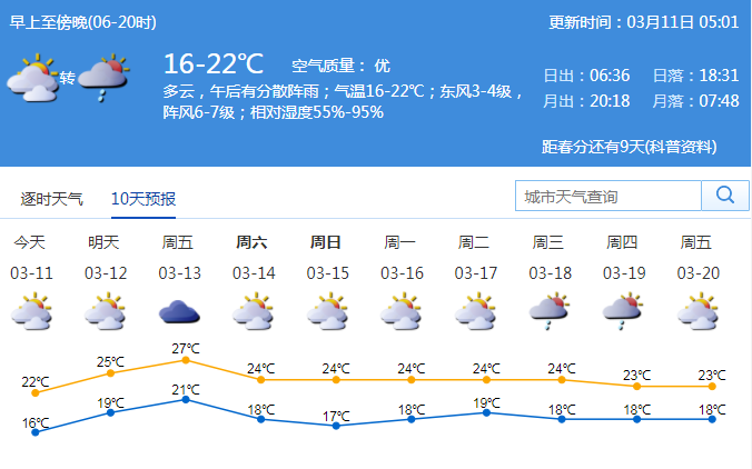 見圳客戶端·深圳新聞網(wǎng)2020年3月11日訊 據(jù)市氣象臺消息,今日深圳多云,午后有分散陣雨;氣溫16-22℃;東風3-4級,陣風6-7級;相對濕度55%-95%。