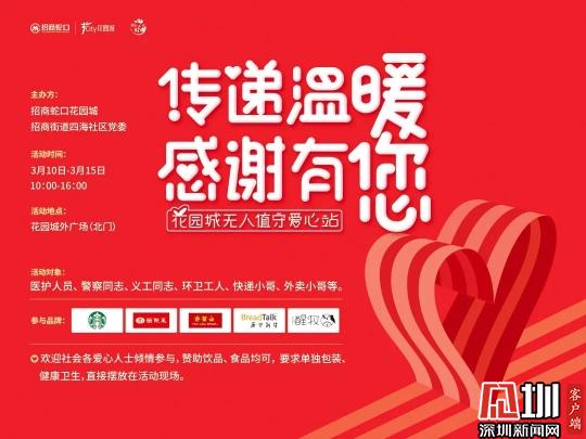 見圳客戶端·深圳新聞網(wǎng)訊(記者 王志明)他們奔波勞累,保障我們生活的秩序與安全他們勇敢逆行盡力守護(hù)城市的正常運(yùn)轉(zhuǎn):醫(yī)護(hù)人員、警察同志、社區(qū)工作人員、義工同志、環(huán)衛(wèi)工人、快遞小哥、外賣小哥……今天的招商街道,多了一道靚麗的風(fēng)景線。 為了向這群最可愛的人表達(dá)我們的感恩、感動,招商街道四海社區(qū)黨委攜手招商蛇口花園城,共同開啟“無人值守愛心站”公益活動,每天提供上千份愛心食品免費(fèi)領(lǐng)取,感謝在這座城市里那些不斷奔波守護(hù)著大家生活的平凡英雄們。 活動時間:3月10日至3月15日 活動地點(diǎn):花園城外廣場 活動對象:醫(yī)護(hù)人員、警察同志、社區(qū)工作人員、 義工同志、環(huán)衛(wèi)工人、快遞小哥、外賣小哥等 除了星巴克、面包新語、面點(diǎn)王、許留山、醒牧等商家熱心公益傾情參與此次公益活動,花園城的許多員工也自發(fā)的采購起來,抱著一份份愛與尊敬時刻補(bǔ)貨,用自己微小的力量幫助著逆行者們。 花園城無人值守愛心站活動時間為3月10日至15日,持續(xù)6天,歡迎社會愛心人士傾情參與食品贊助,所提供物品采用單獨(dú)包裝、健康衛(wèi)生,直接擺放在活動現(xiàn)場即可。 春暖花開,山河無恙,人間皆安。待疫情結(jié)束,我們定會溫暖相遇在這座鮮花簇?fù)淼某鞘欣铩?/p>