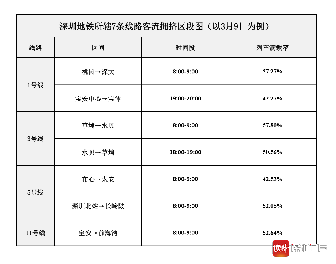 與此同時(shí),深圳地鐵也對(duì)近期各線路區(qū)段的客流變化規(guī)律進(jìn)行了全面分析。數(shù)據(jù)顯示,地鐵列車(chē)滿載率超過(guò)40%的時(shí)段(指實(shí)際列車(chē)載客人數(shù)占比為額定載客人數(shù)的4成以上),主要集中在早上8:00至9:00之間。其中,1號(hào)線固戍至深大區(qū)段、3號(hào)線丹竹頭至老街區(qū)段、5號(hào)線民治至西麗區(qū)段和長(zhǎng)龍至太安區(qū)段、11號(hào)線橋頭至后海區(qū)段的客流均相對(duì)較大。市民乘客在高峰期如需搭乘地鐵,可留意各線路區(qū)段的擁擠情況,提前合理規(guī)劃乘車(chē)路線、錯(cuò)峰出行。