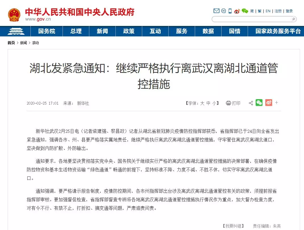 根據(jù)湖北的緊急通知,繼續(xù)嚴格執(zhí)行離武漢離湖北通道管控措施。