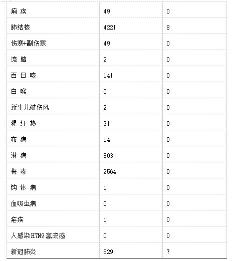 其中,甲類傳染病無報(bào)告,乙類傳染病甲類管理的新冠肺炎報(bào)告病例829例。乙類除傳染性非典型肺炎、脊髓灰質(zhì)炎、人感染高致病性禽流感、狂犬病、炭疽、乙腦、白喉、血吸蟲病、人感染H7N9禽流感無發(fā)病、死亡報(bào)告外,其余18種傳染病均有病例報(bào)告。