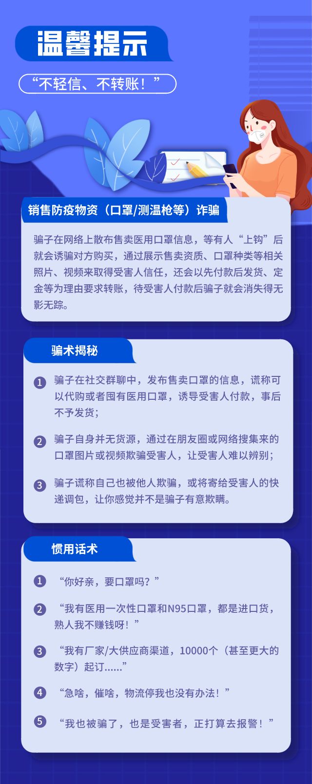 “我來報(bào)警!群里有人騙我口罩錢!” 3月4日,事主李小姐匆匆來到深圳市公安局福田分局香蜜湖派出所報(bào)案并講述了自己被騙的經(jīng)過。 此前李小姐在某社區(qū)賣菜群里,看到了一名群友發(fā)布“口罩資源”的信息,于是加其為好友,對方向李小姐展示了售賣資質(zhì)以及售賣口罩的樣品,一步步讓李小姐放松了警惕,雙方以1.75元/個醫(yī)用口罩、9元/個N94口罩的價(jià)格談妥交易。 隨后李小姐通過轉(zhuǎn)賬先向?qū)Ψ劫徺I了一批口罩。李小姐覺得對方還挺靠譜的,就又分四次向?qū)Ψ睫D(zhuǎn)賬,分別郵寄給自己不同的朋友,累計(jì)向?qū)Ψ睫D(zhuǎn)賬了990元。 不料所有的錢轉(zhuǎn)過去之后,這個群友卻消失了,發(fā)信息不回,打視頻不接,雖未拉黑但也沒任何回應(yīng)?!笆謿馊耍或_的錢雖然不多,但是一定要給詐騙分子嚴(yán)懲!”李小姐對民警這樣講述道。 民生小案無小事,數(shù)百元現(xiàn)金被騙,電單車被盜……這些看似平常的一件件“小”案,背后牽連的卻是廣大群眾的幸福感、安全感。 香蜜湖派出所民警聚力破小案,服務(wù)大民生,做到有案必偵,快偵快破。經(jīng)多方面調(diào)查后,最終確定了嫌疑人的身份——游某。3月9日11時許,福田警方將嫌疑人游某抓獲。 ▲嫌疑人通過網(wǎng)絡(luò)發(fā)布虛假信息進(jìn)行詐騙 據(jù)了解,游某于2019年下半年來到深圳,此前加入了一個社區(qū)賣菜群。不久前,游某因手頭緊,于是就在群里發(fā)布消息,謊稱自己有大量口罩待出售。 游某在群里發(fā)布買賣“口罩”信息,會不會還有其他的受害者?這是民警第一時間的直覺。隨著調(diào)查的深入,民警發(fā)現(xiàn)還有其他受害者與游某聯(lián)系購買“口罩”及多筆手機(jī)轉(zhuǎn)賬記錄,金額雖然不大,大多為80元、100元、115元、175元……各個個案的涉案金額看起來都是“小錢”,但我們的民警還是盡心盡力,絲毫沒有放松,一項(xiàng)項(xiàng)認(rèn)真核實(shí)并一一做好記錄。 據(jù)初步統(tǒng)計(jì),從1月30日至今,游某通過向他人售賣口罩實(shí)施詐騙,累計(jì)詐騙4000余元,被騙的受害人多達(dá)16人! ▲民警抓獲嫌疑人 現(xiàn)游某對利用網(wǎng)絡(luò)實(shí)施口罩詐騙的行為供認(rèn)不諱,已被警方依法刑事拘留,在香蜜湖派出所民警的聯(lián)系下,目前已有受害群友相繼前來協(xié)助調(diào)查,案件仍在進(jìn)一步調(diào)查中。 ▲民警審訊嫌疑人 警言警語 香蜜湖派出所 民警鄭卓 疫情期間,不少企業(yè)和個人紛紛采購口罩等防護(hù)用品。針對利用口罩等防疫物資實(shí)施詐騙等違法犯罪行為的不法分子,福田警方堅(jiān)決從嚴(yán)從快依法打擊。廣大市民謹(jǐn)記,購買口罩、消毒液等防疫物資,要通過正規(guī)途徑,做到“不輕信、不轉(zhuǎn)賬”,避免上當(dāng)受騙。