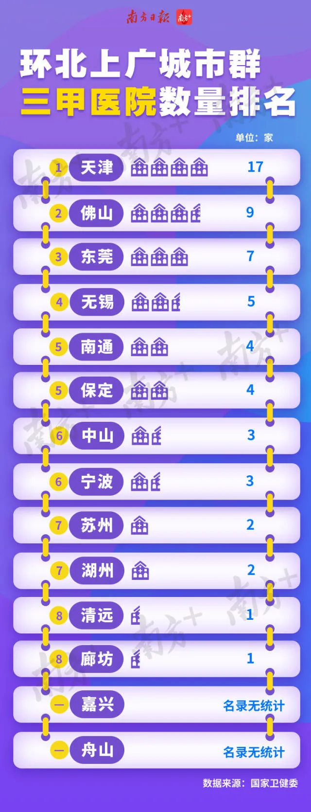 從統(tǒng)計(jì)表中可以看到,天津三甲醫(yī)院數(shù)量一騎絕塵。而廣東的佛山、東莞三甲醫(yī)院數(shù)量也不少,醫(yī)療實(shí)力值得重視。中山名列第六,在國(guó)家衛(wèi)健委名錄中甚至高于蘇州。