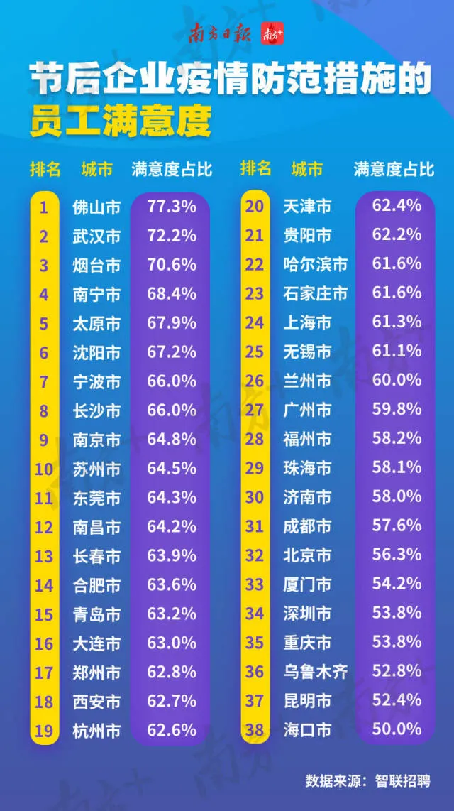 從上述《報(bào)告》中可以看出,佛山市企業(yè)的員工滿意度是全國(guó)最高的,高達(dá)77.3%,與全城“停擺”的武漢、山東煙臺(tái)齊齊超過七成滿意度。