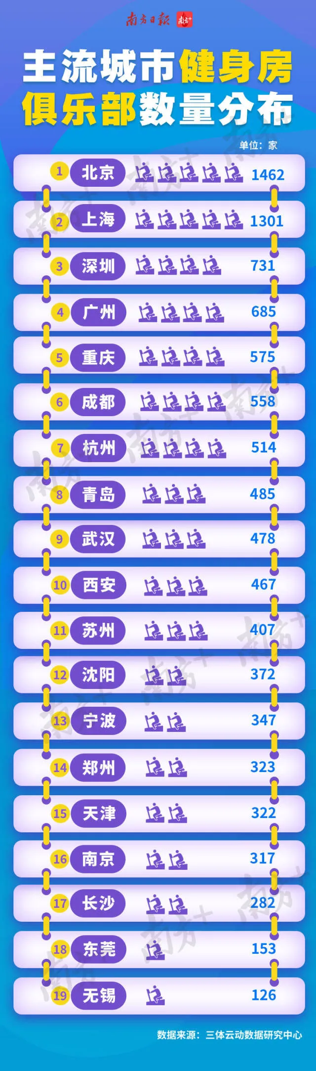 南方經(jīng)濟(jì)智庫(kù)梳理三體云動(dòng)數(shù)據(jù)研究中心《2018中國(guó)健身行業(yè)數(shù)據(jù)報(bào)告》的數(shù)據(jù)發(fā)現(xiàn),北上廣深城市健身房數(shù)量領(lǐng)跑全國(guó),深圳、廣州分列第三和第四。前19名均為經(jīng)濟(jì)發(fā)達(dá)城市或主要省會(huì)城市。