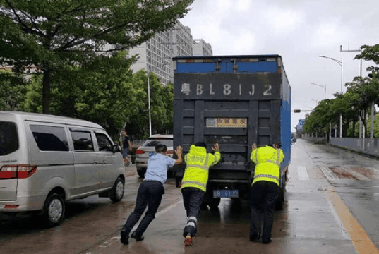 你們,在瓢潑大雨中幫助車主推車;