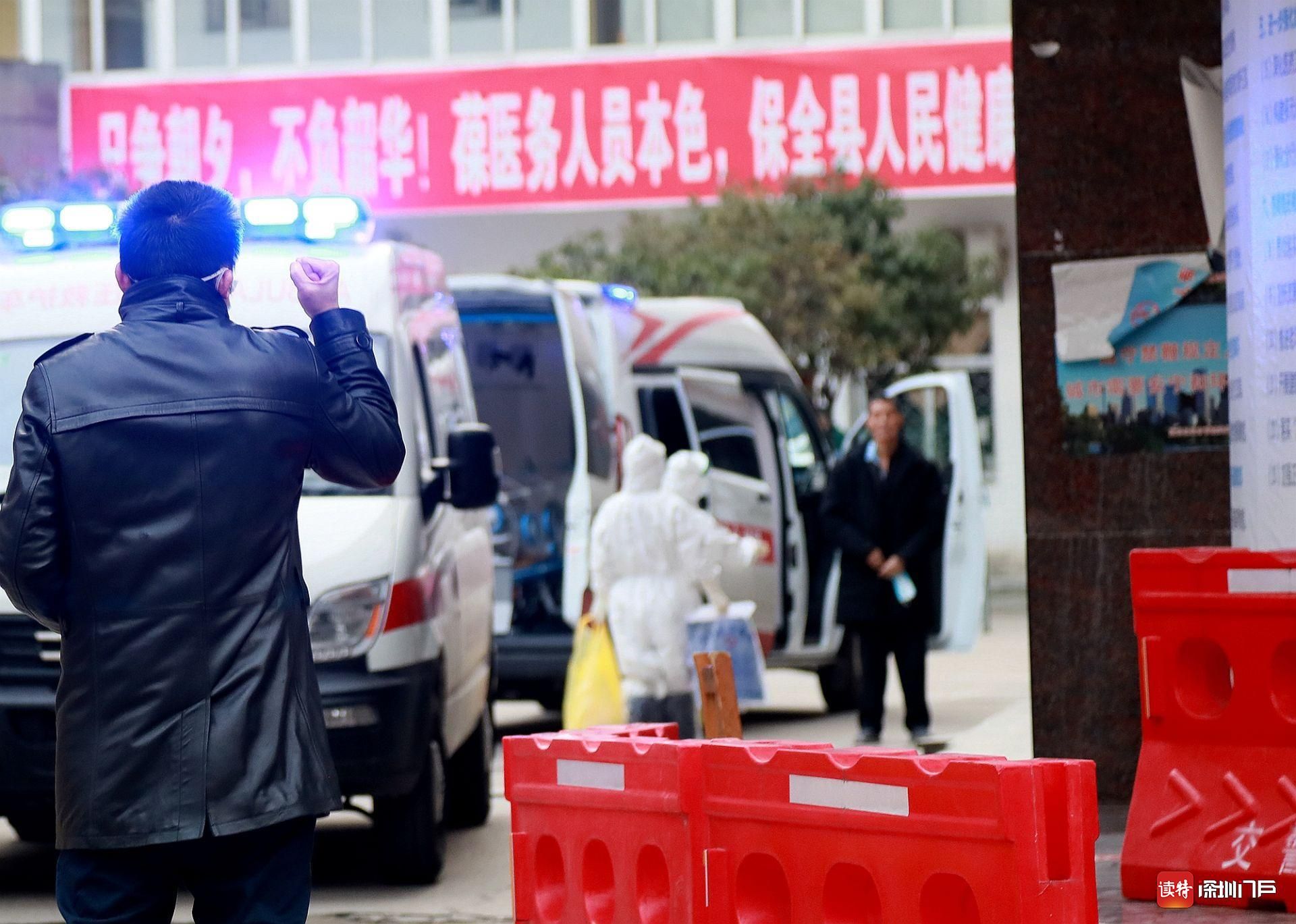2月29日,監(jiān)利縣中醫(yī)院,一位重癥患者即將轉(zhuǎn)往荊州救治。患者的兒子聞?dòng)嵹s來(lái),遠(yuǎn)遠(yuǎn)地向父親舉起拳頭,高喊“加油”。