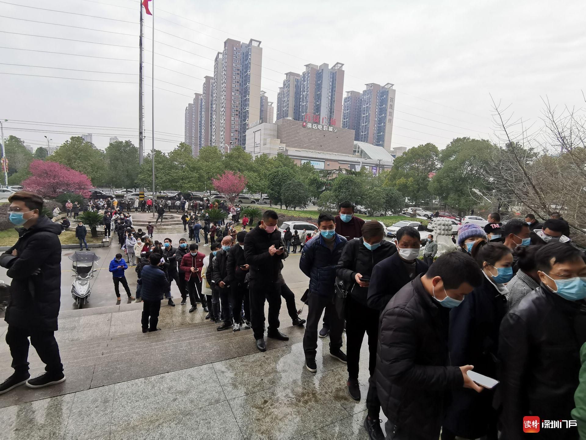 2月23日,監(jiān)利縣交通局門前排隊(duì)申請(qǐng)返回工作地的當(dāng)?shù)厝罕姟2痪?,湖北再次升?jí)封控措施,直到近日才逐漸恢復(fù)正常交通。